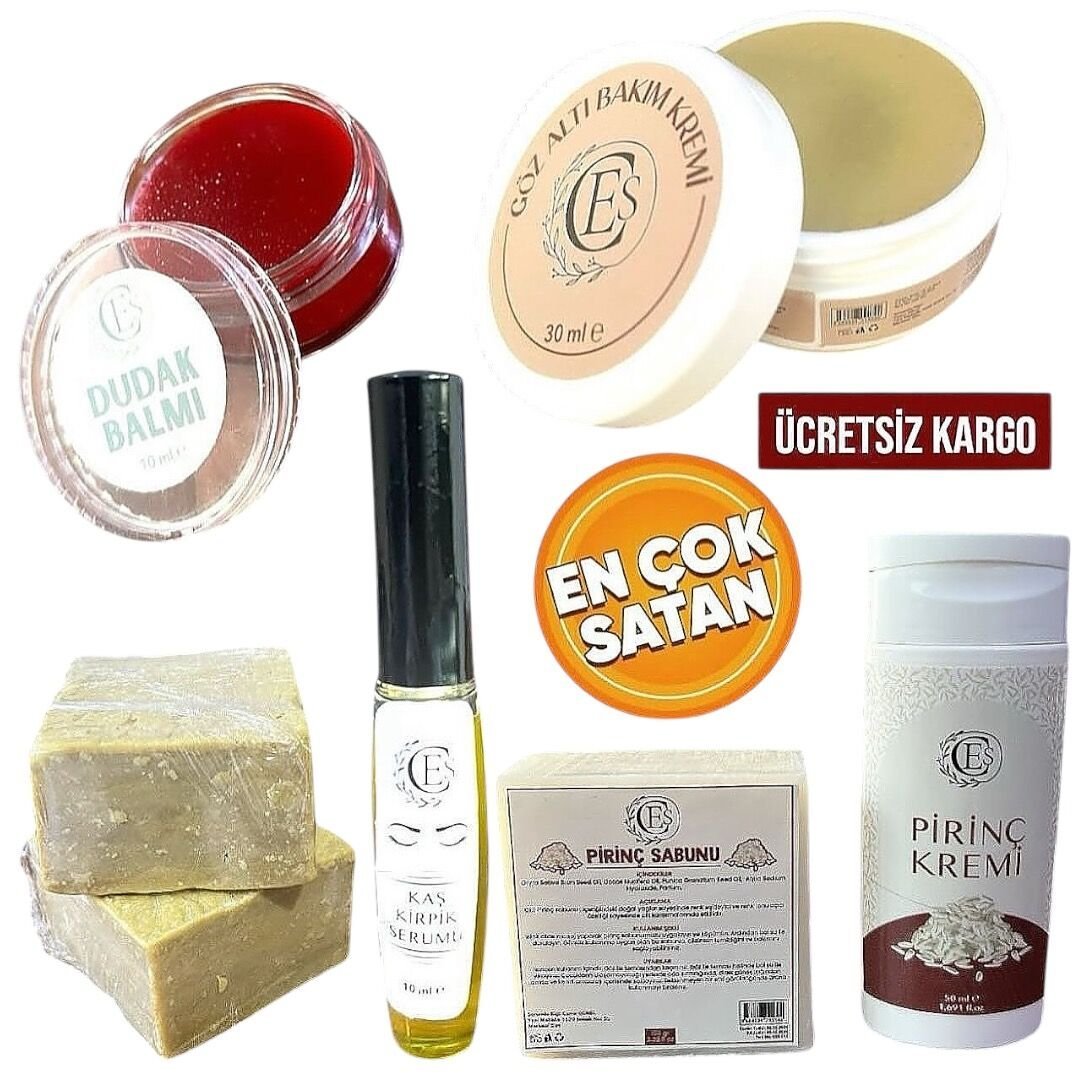1 PİRİNÇ KREMİ+1 PİRİNÇ SABUNU + 1 GÖZ ALTI KREMİ+1 KAŞ KİRPİK SERUMU+ 1 DUDAK DOLG +2 BITTIM SABUNU